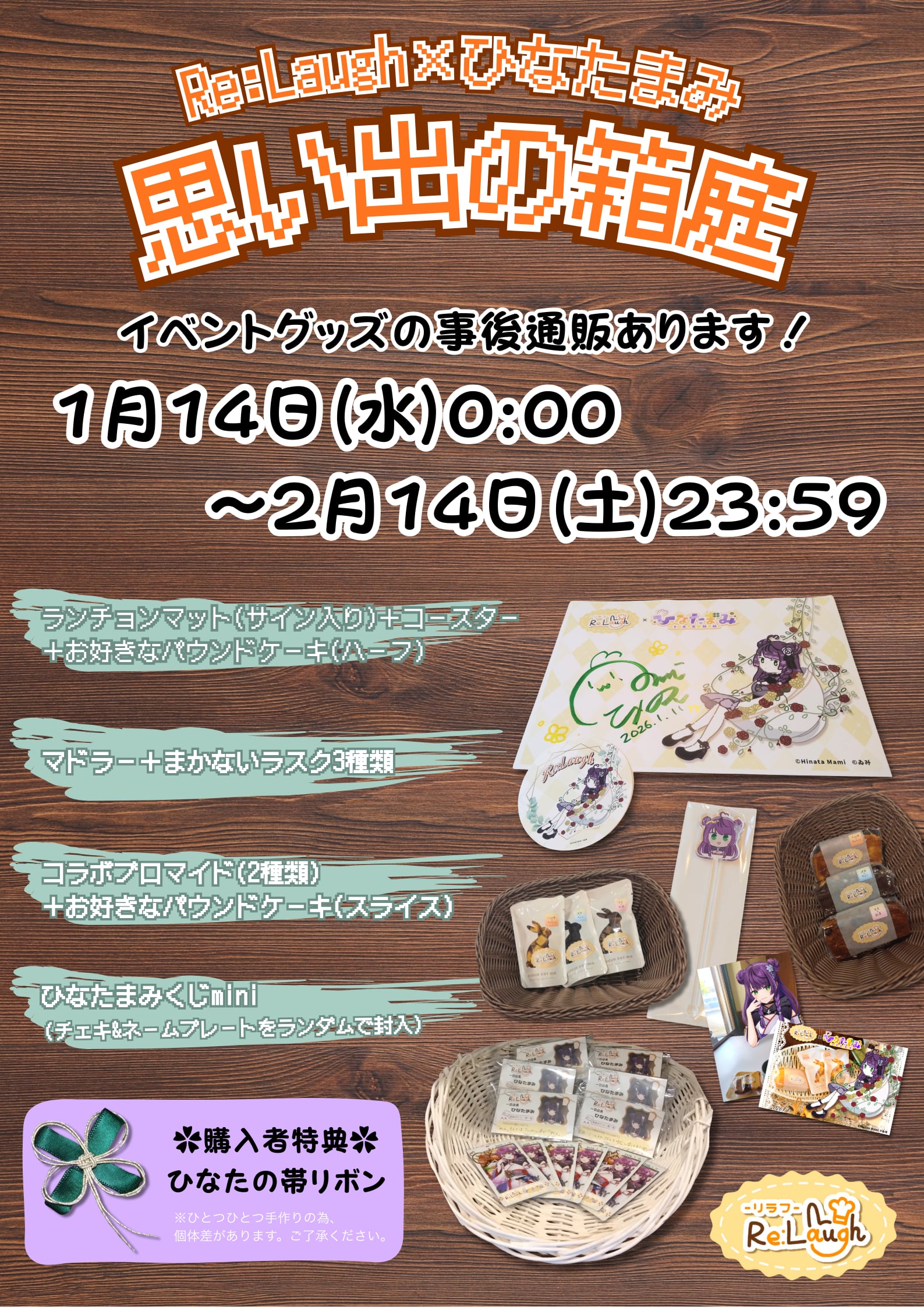 1月11日に店舗でおこなわれた、声優VTuberのひなたまみさんのリアルイベント、Re:Laugh×ひなたまみ 『思い出の箱庭』のイベントグッズの事後通販を期間限定でおこなっています。